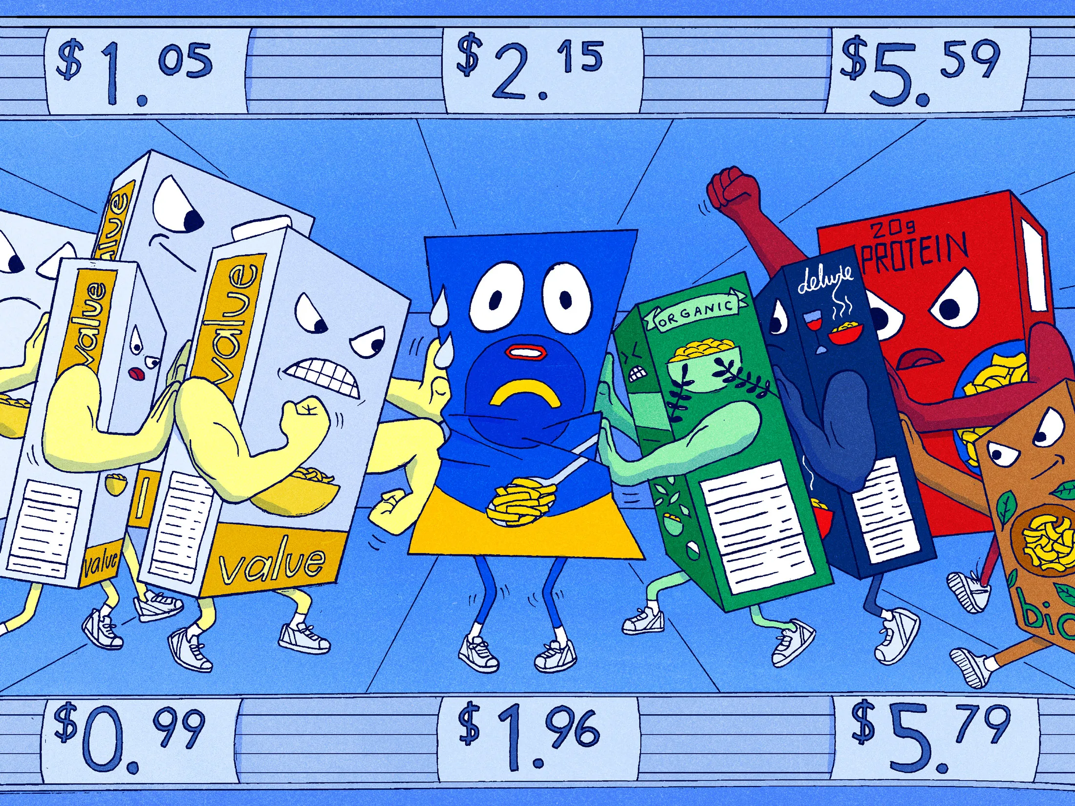 Among new arrivals is Goodles, a protein-packed option with eye-catching neon branding that costs more than twice as much as a box of Kraft Mac & Cheese. At a Target in Chicago, Goodles’ Shella Good and Bling Bling Bac’n varieties are picked over; larger boxes with squeezy cheese sauce are completely sold out. Adjacent to the Kraft packages are two rows of Target’s low-cost Market Pantry brand: At 65 cents a pack, the red boxes cost about a third of the price as the Kraft perched just a few inches away.