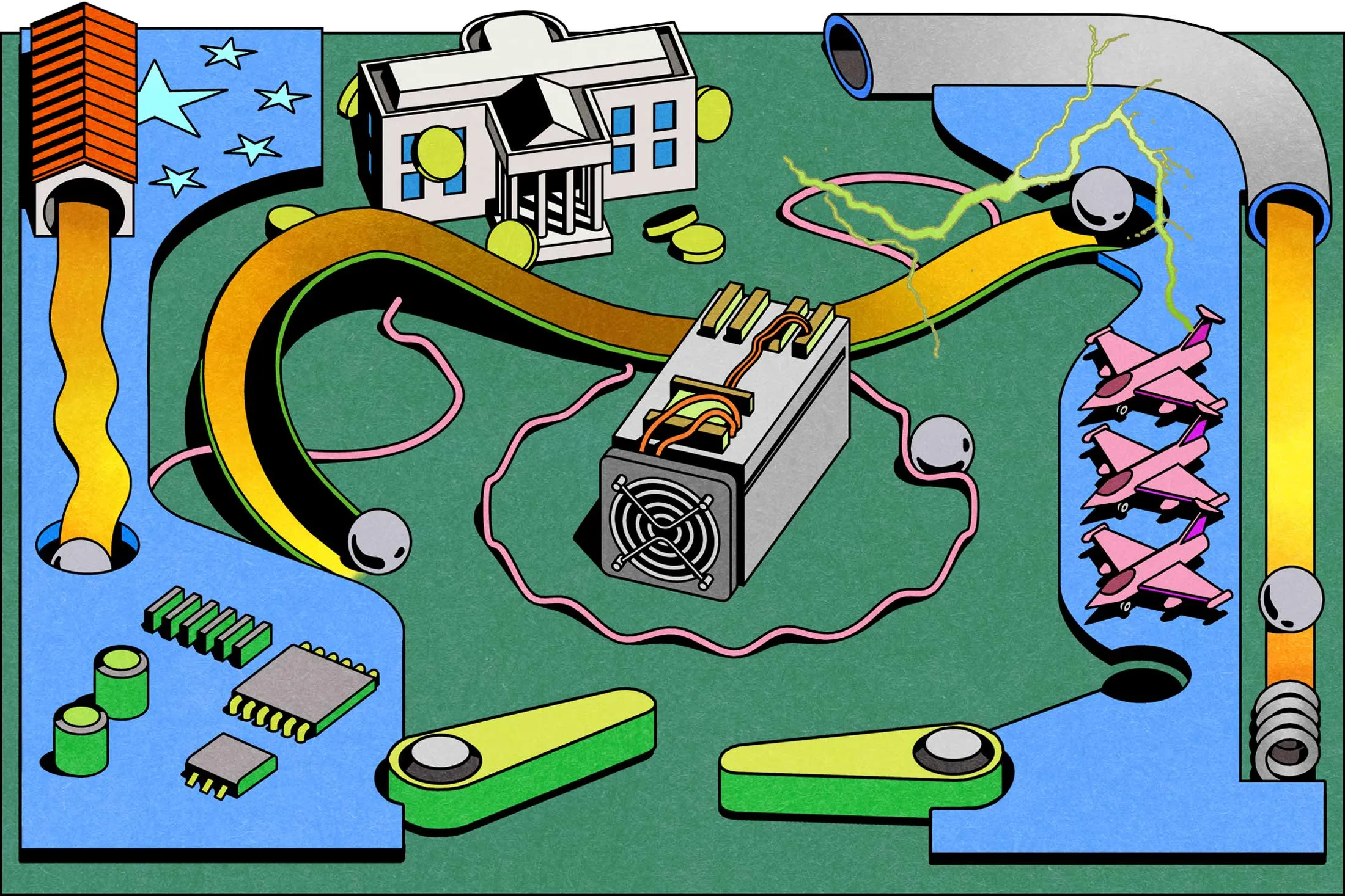 Right now, in settings ranging from purpose-built data centers in rural Texas to converted lumberyards in Borneo, there are racks of shoebox-shaped machines emitting a roar so loud that they sometimes draw complaints from neighbors. Each contains hundreds of application-specific integrated circuits, or ASICs, produced at enormous cost in advanced Taiwanese facilities. The chips are soldered onto three enclosed hashboards that run brute-force calculations, taking directions from a control board. Depending on the precise model, internal fans or a liquid cooling system are used to prevent these components from overheating—a huge draw on the power supply of whatever community they happen to be installed within.