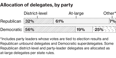 The parties allocate to each state a number of delegates based on population and a variety of other factors that vary state by state. In most states, candidates win delegates based on the votes they receive in primaries and caucuses. The Democratic Party calls these pledged delegates; Republicans call them bound delegates. These delegates are mainly split between at-large delegates, awarded based on the outcome of the statewide vote, and district-level delegates, determined by vote totals in each of the state’s congressional districts.